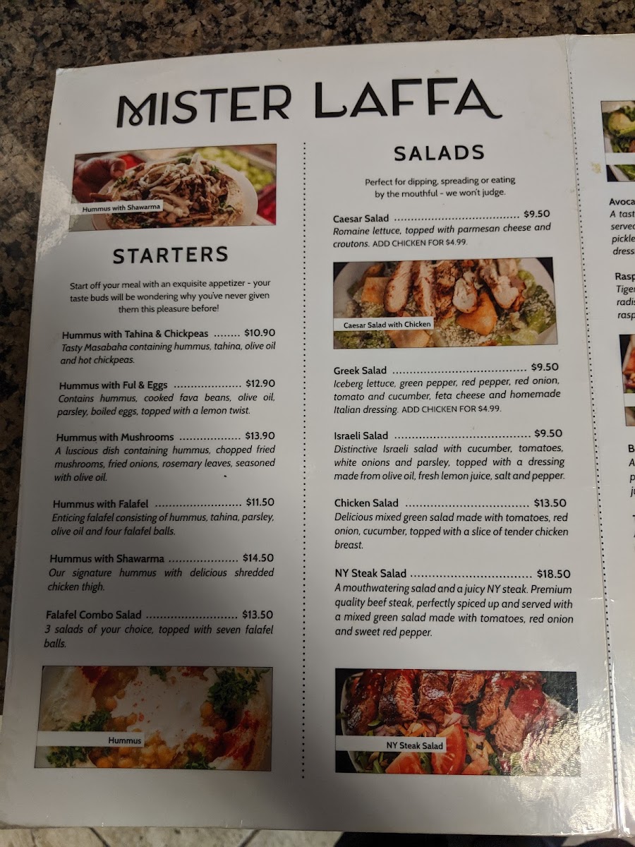 Mister Laffa's signature hummus salad is a must for every meal! Chickpeas mixed with tahini, lemon, olive oil, garlic, and salt - it's authentically Middle Eastern